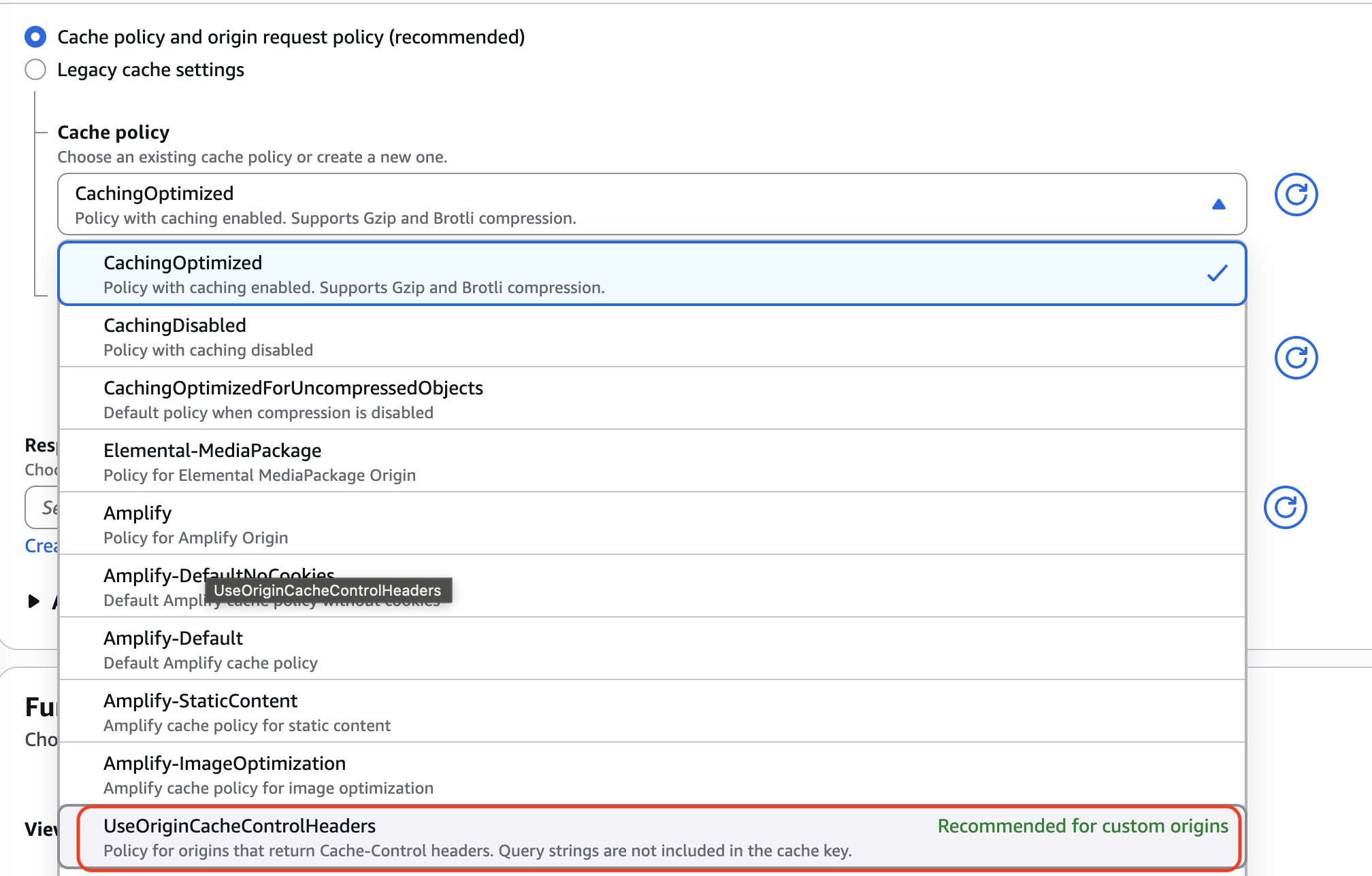 當你進入 CloudFront 的 Default Behavior 設定時,AWS Console 會「貼心」地推薦你使用 UseOriginCacheHeaders 作為快取策略。
