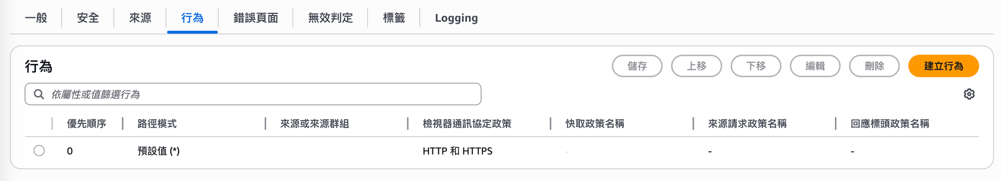 實際進到 CloudFront 的 Behaviors 頁面時,會看到一組預設行為,以及對應的快取相關設定。